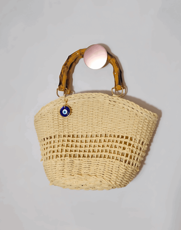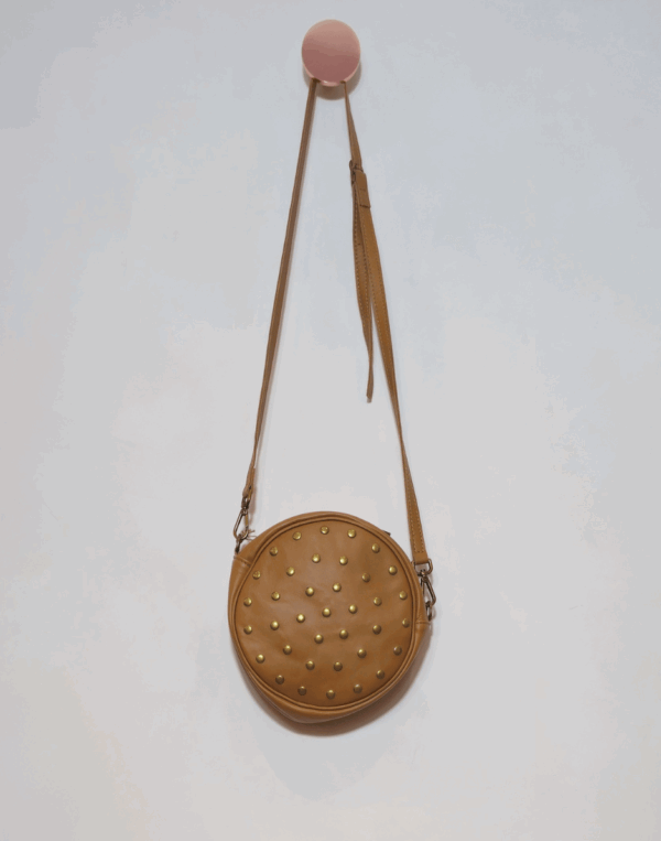 Bolsa redonda (roud bag) com tachas, alças ajustáveis e removíveis.