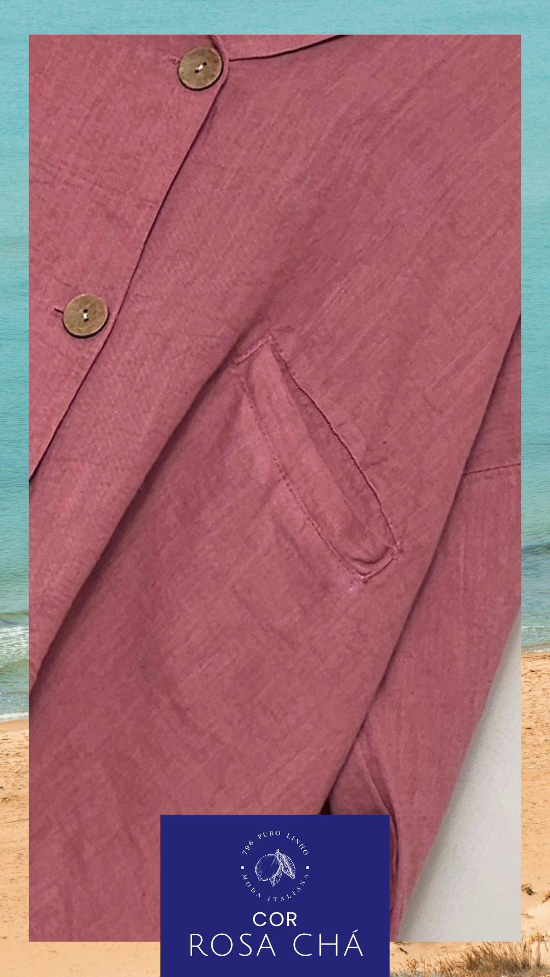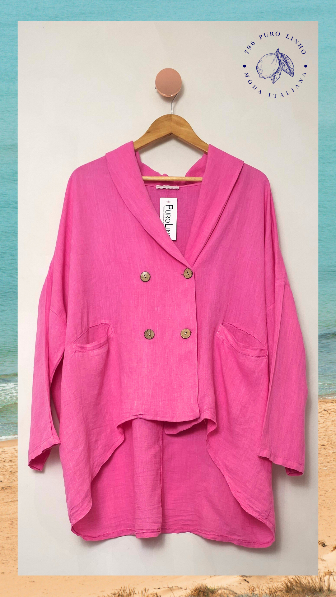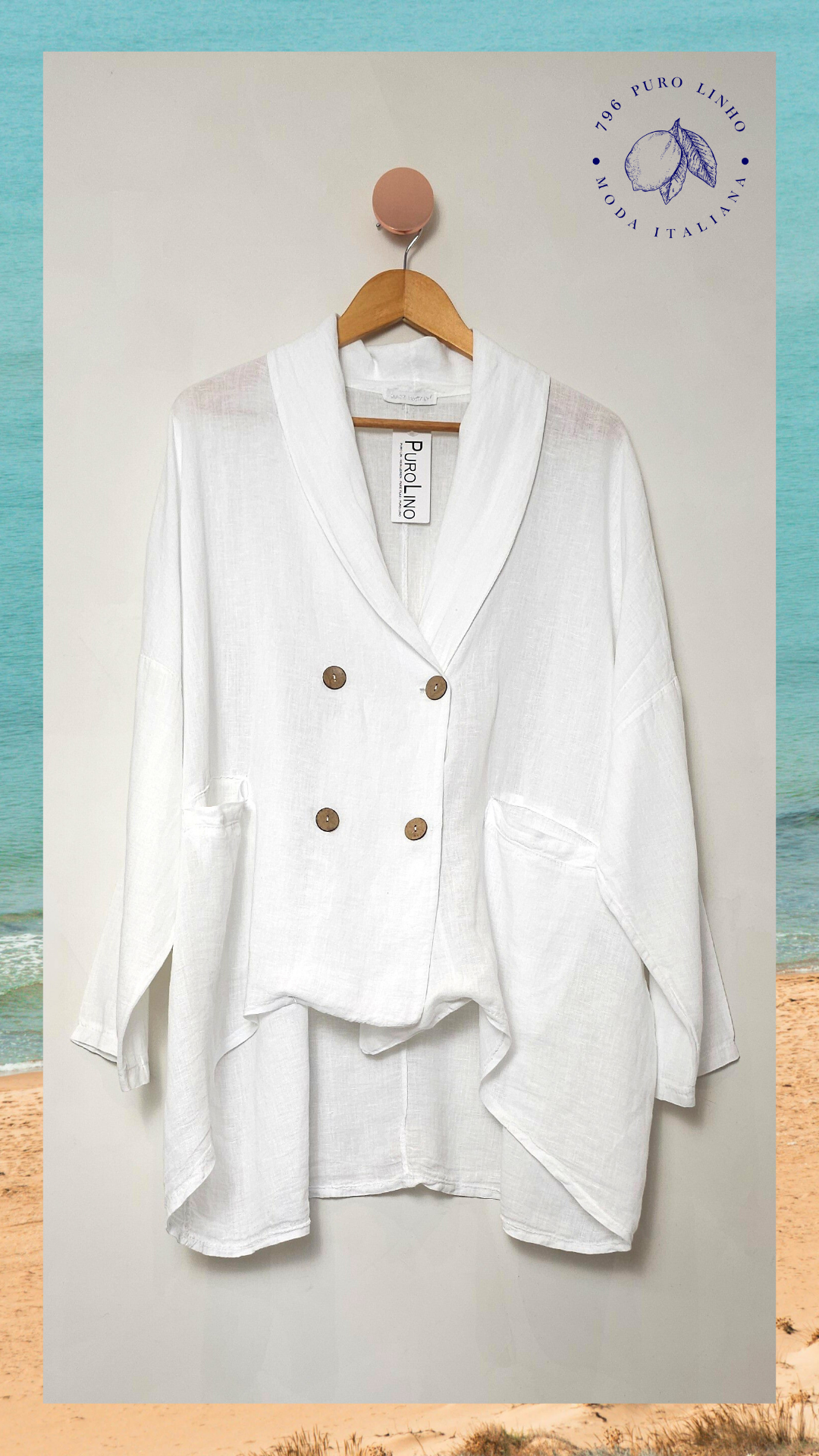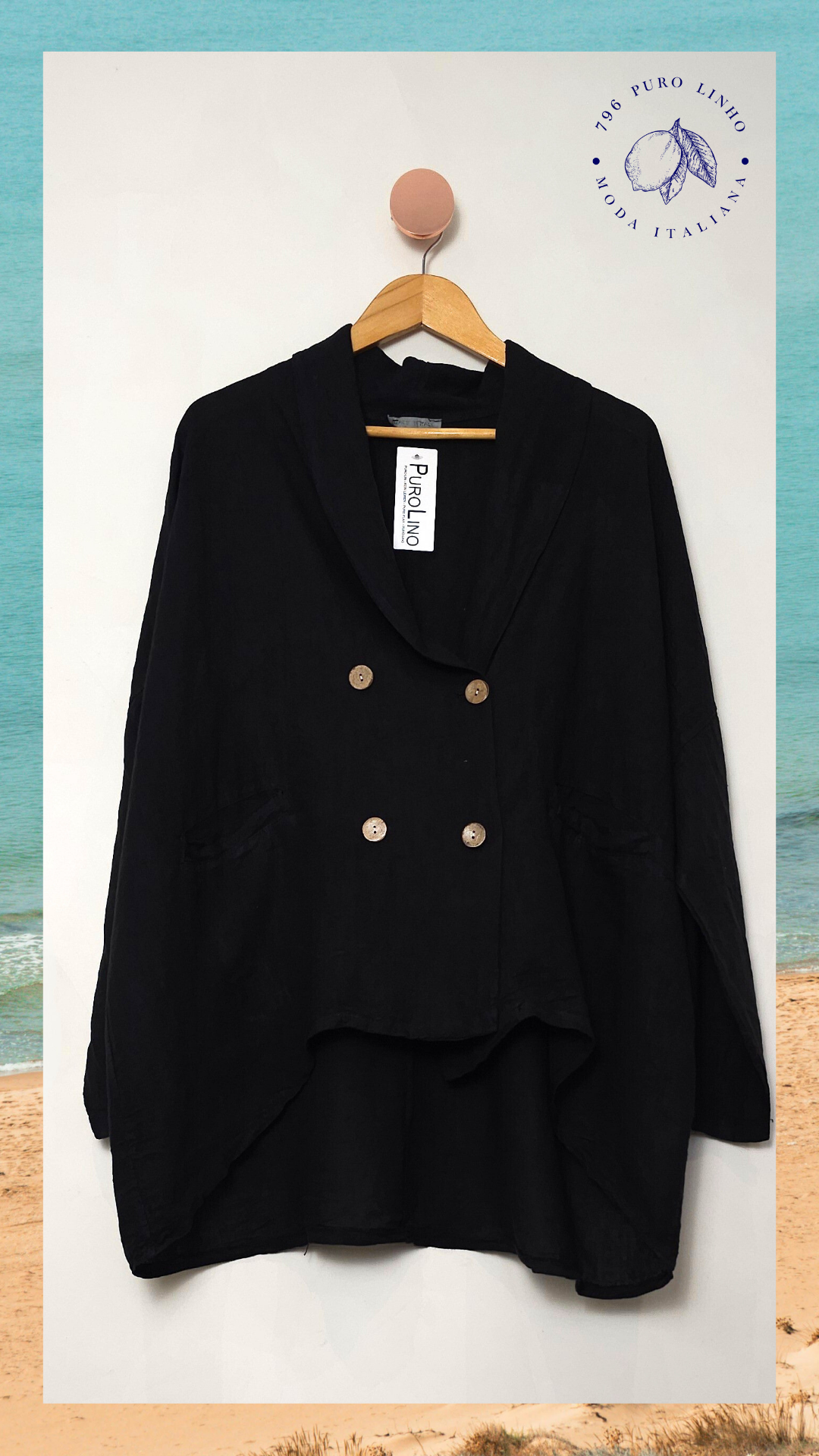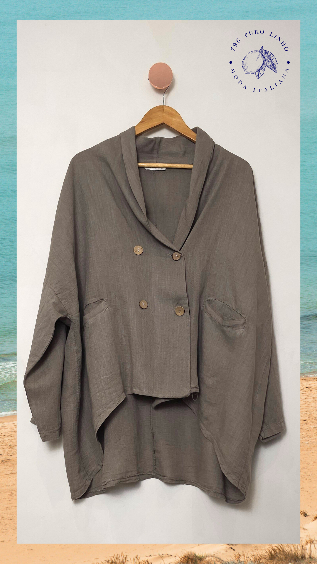 Blazer transpassado com botões em madeira, gola tipo chalé, bolsos frontais e corte assimétrico.