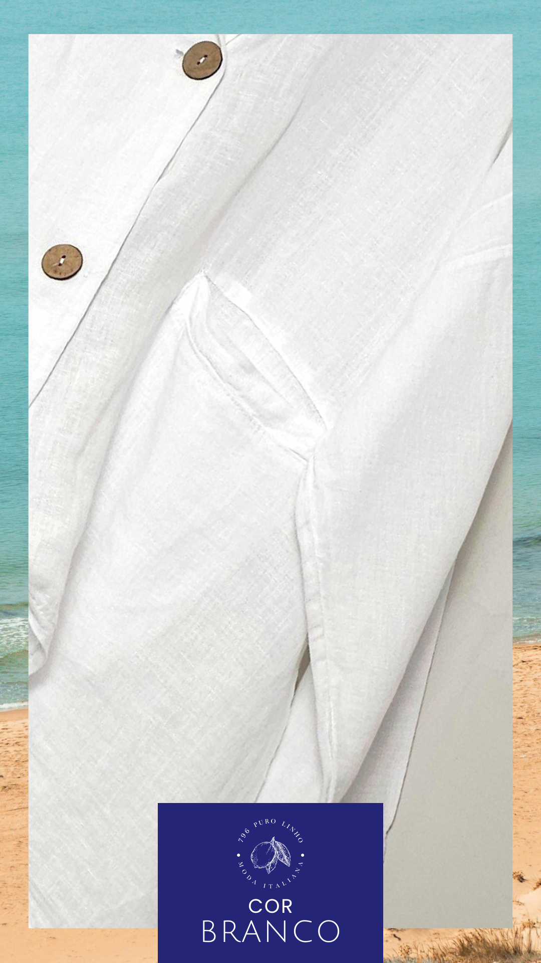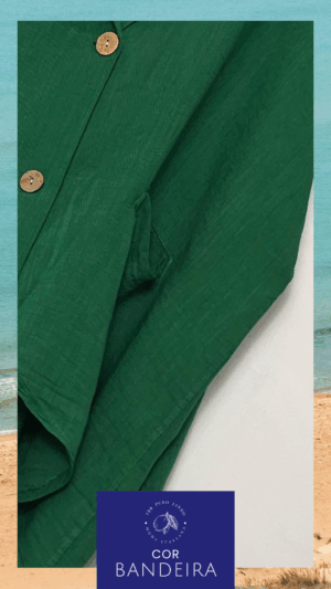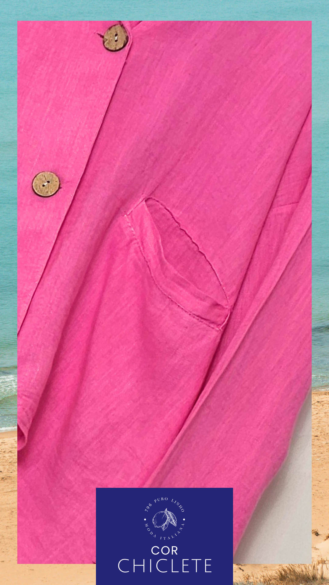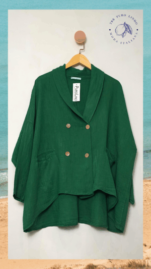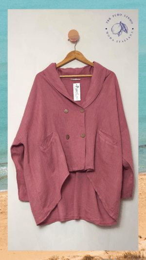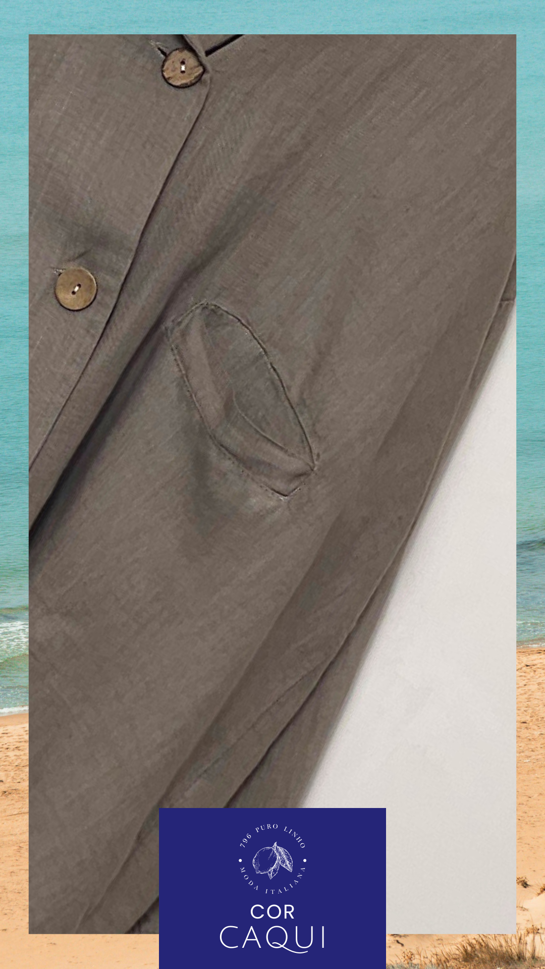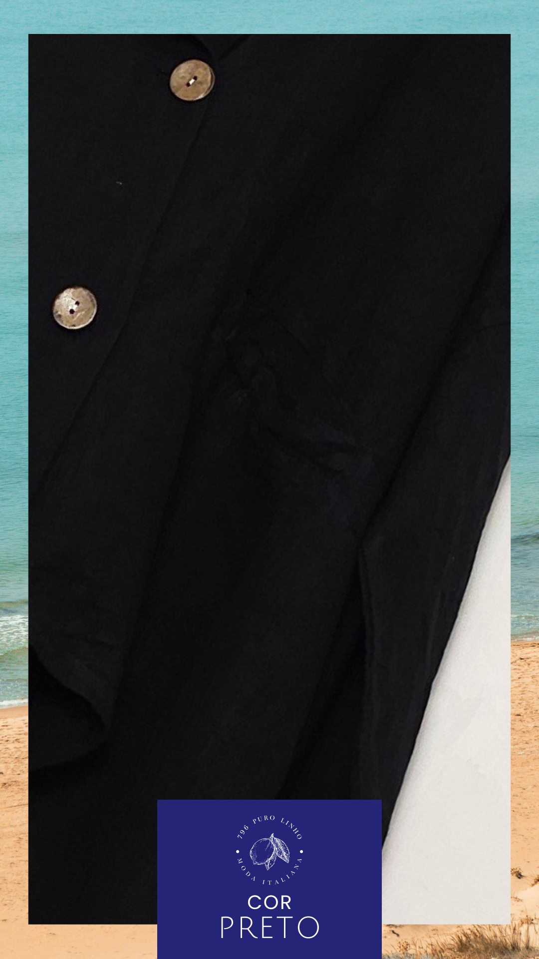 Blazer transpassado com botões em madeira, gola tipo chalé, bolsos frontais e corte assimétrico.
