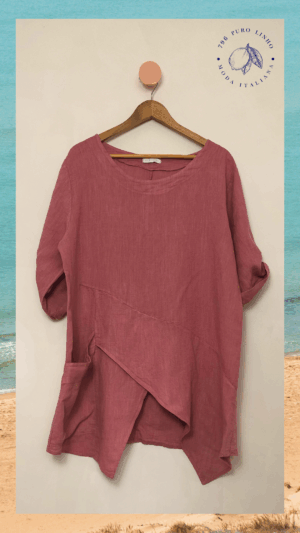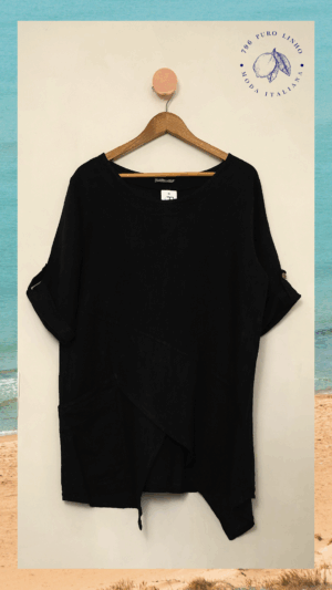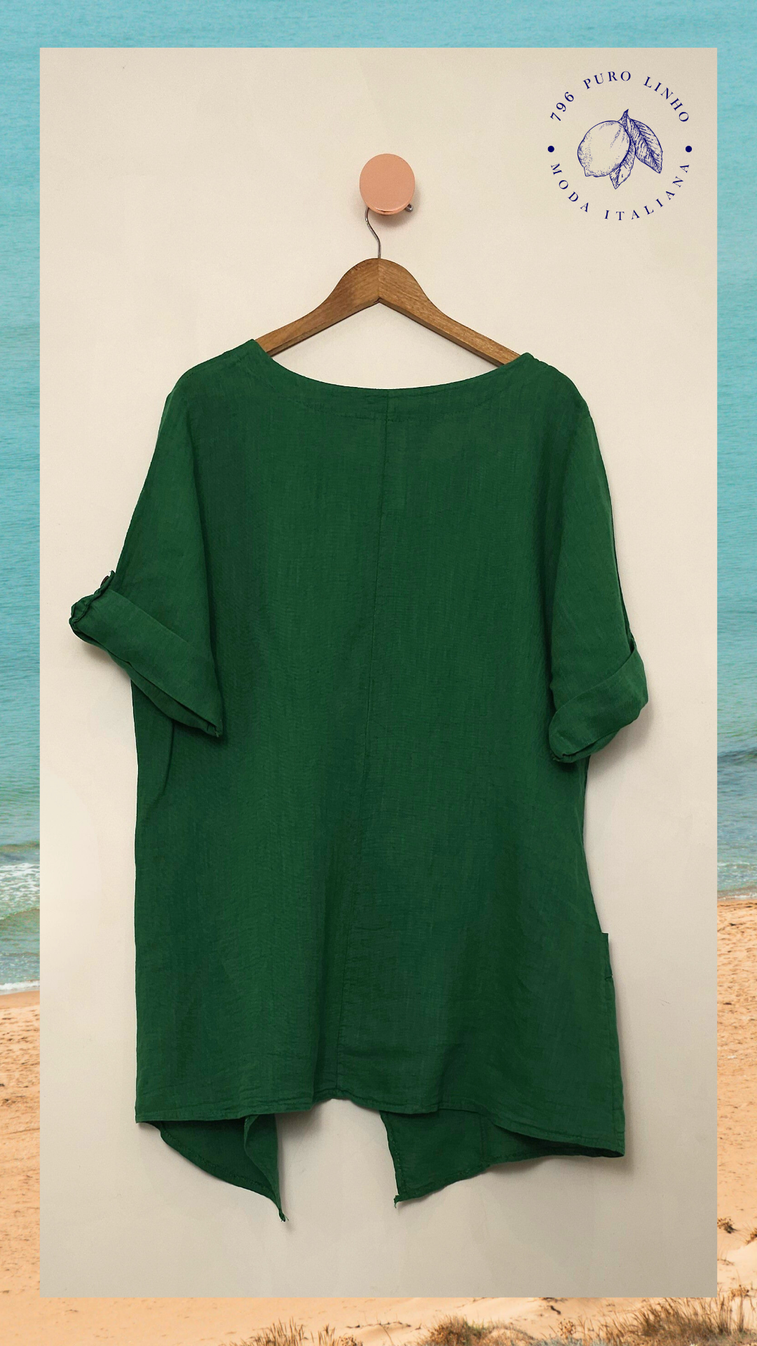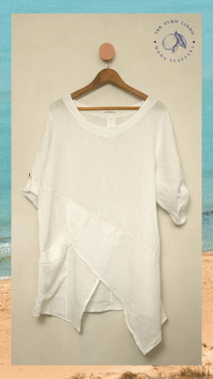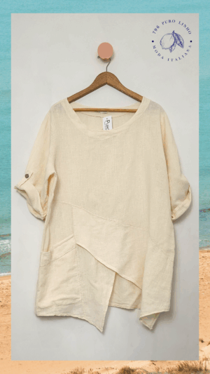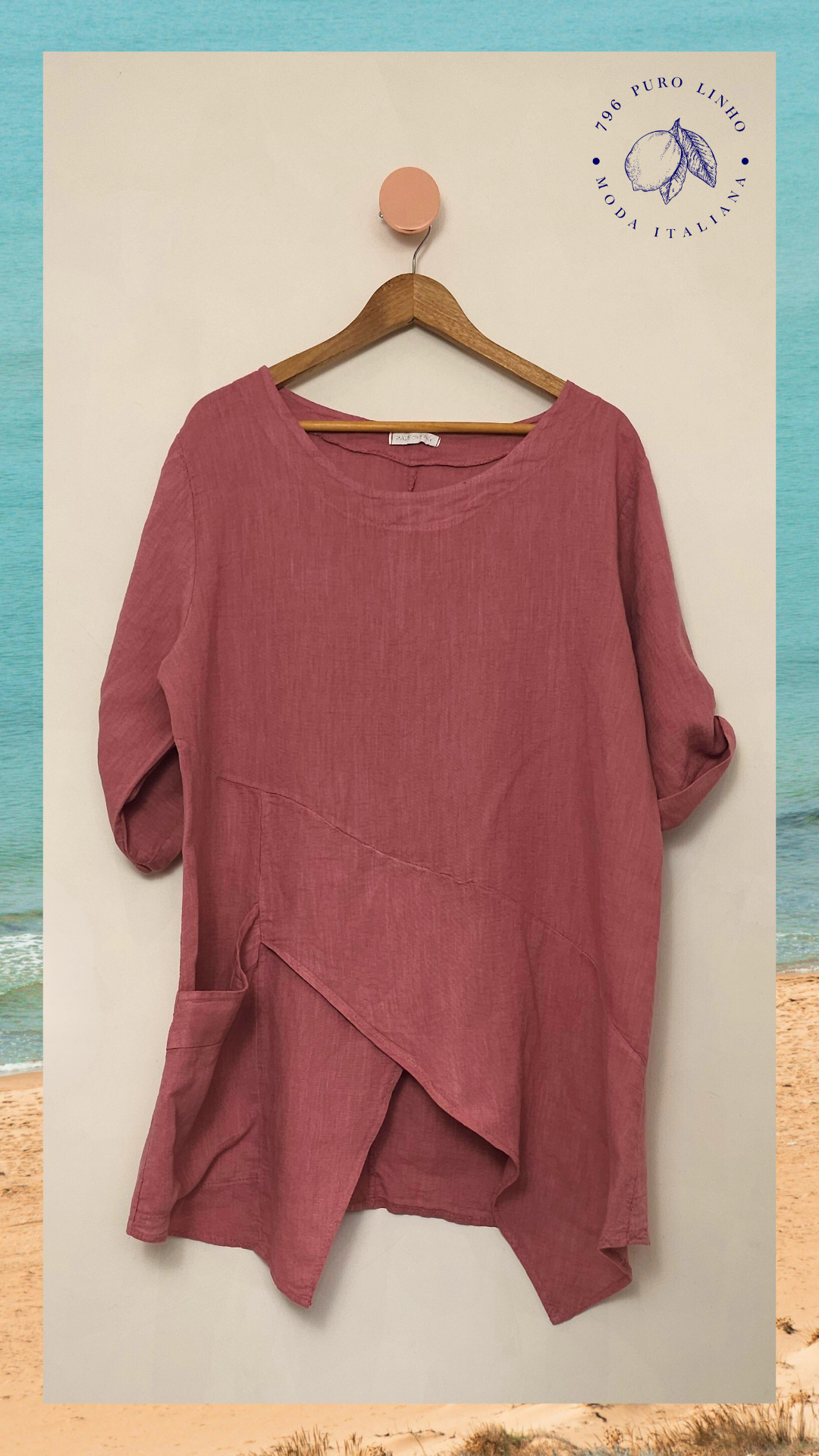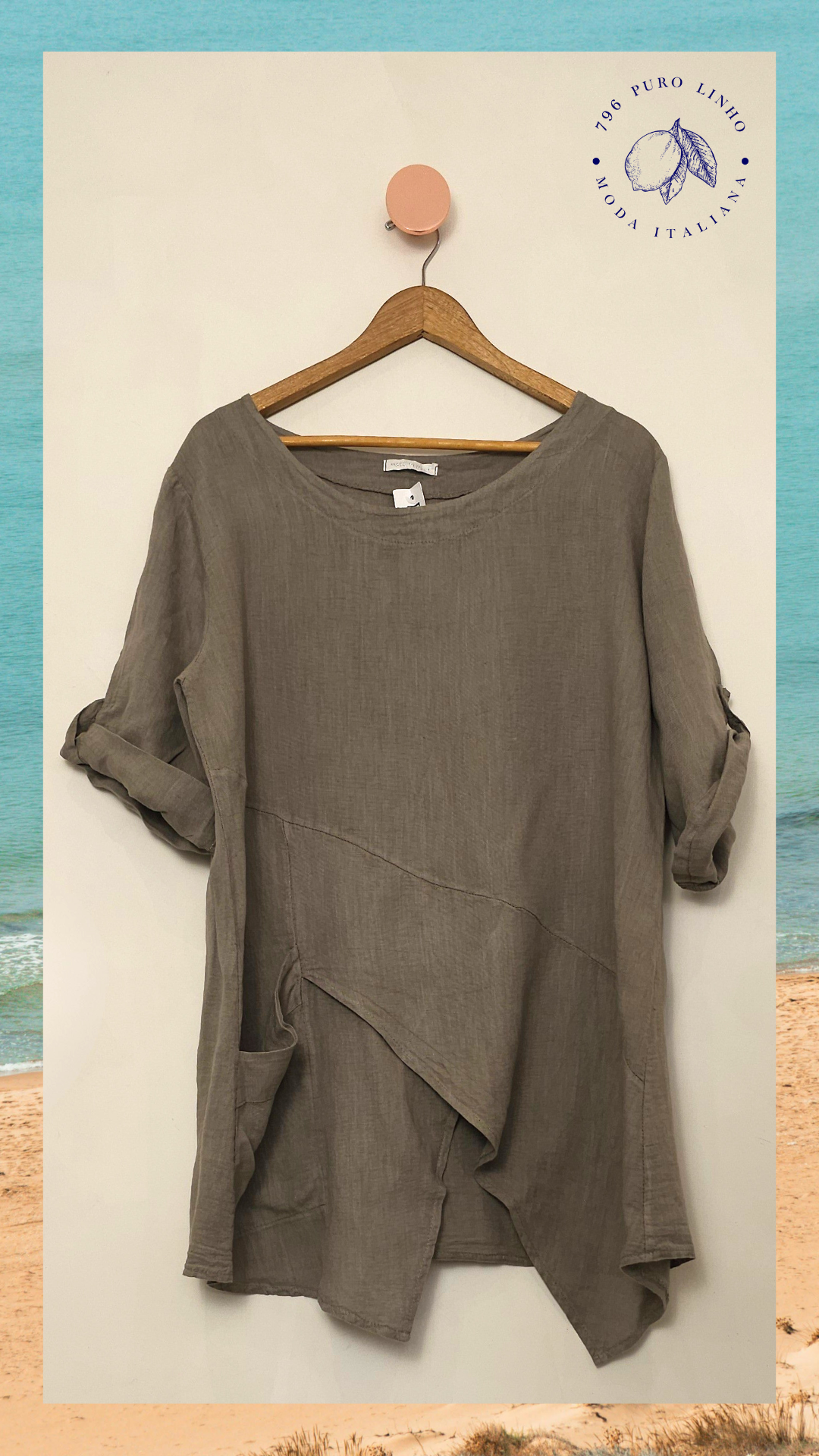 Blusa assimétrica com recortes, gola canoa e ajuste martingale nas mangas.