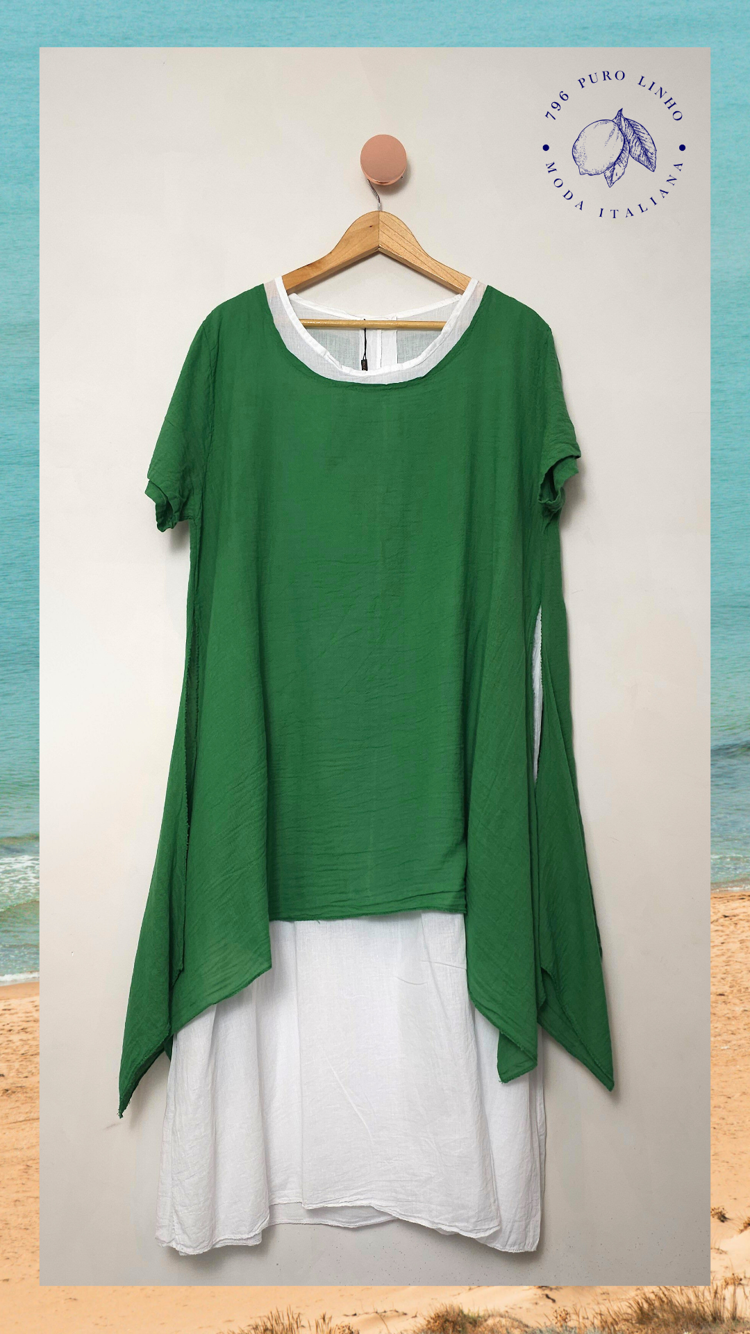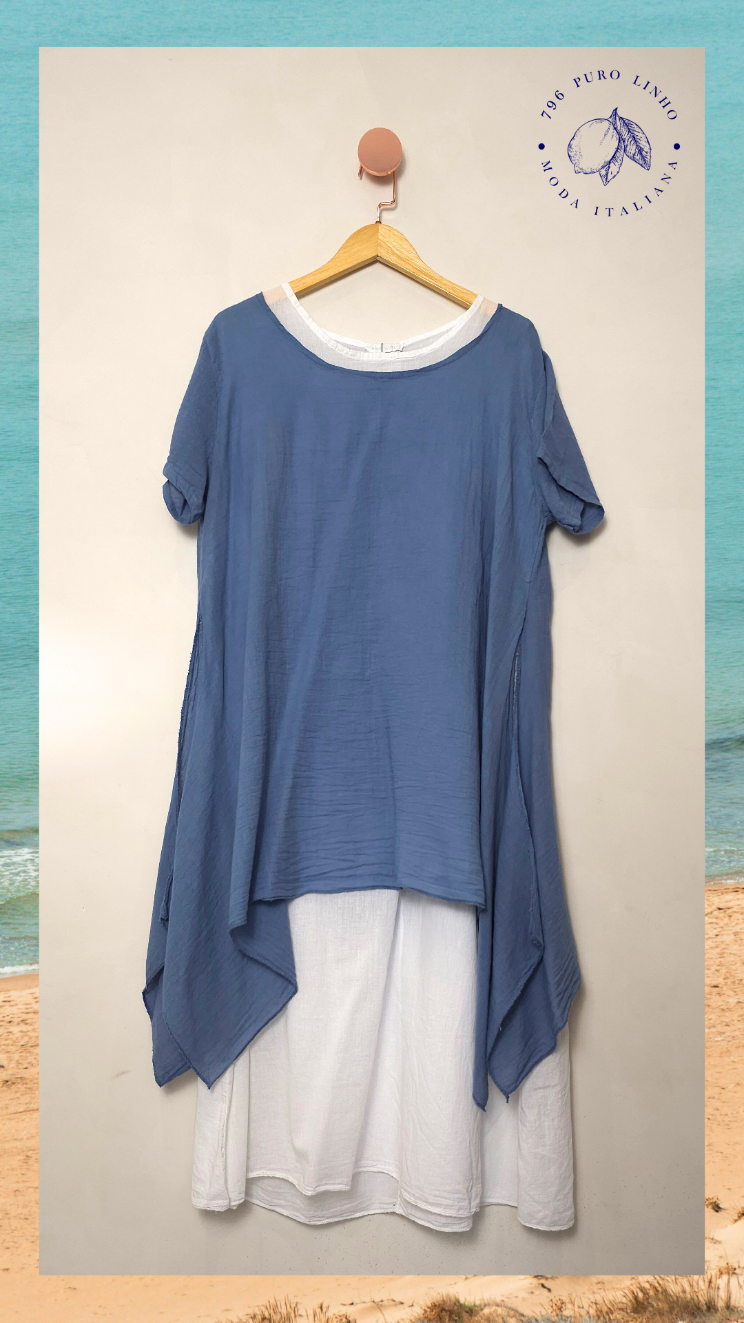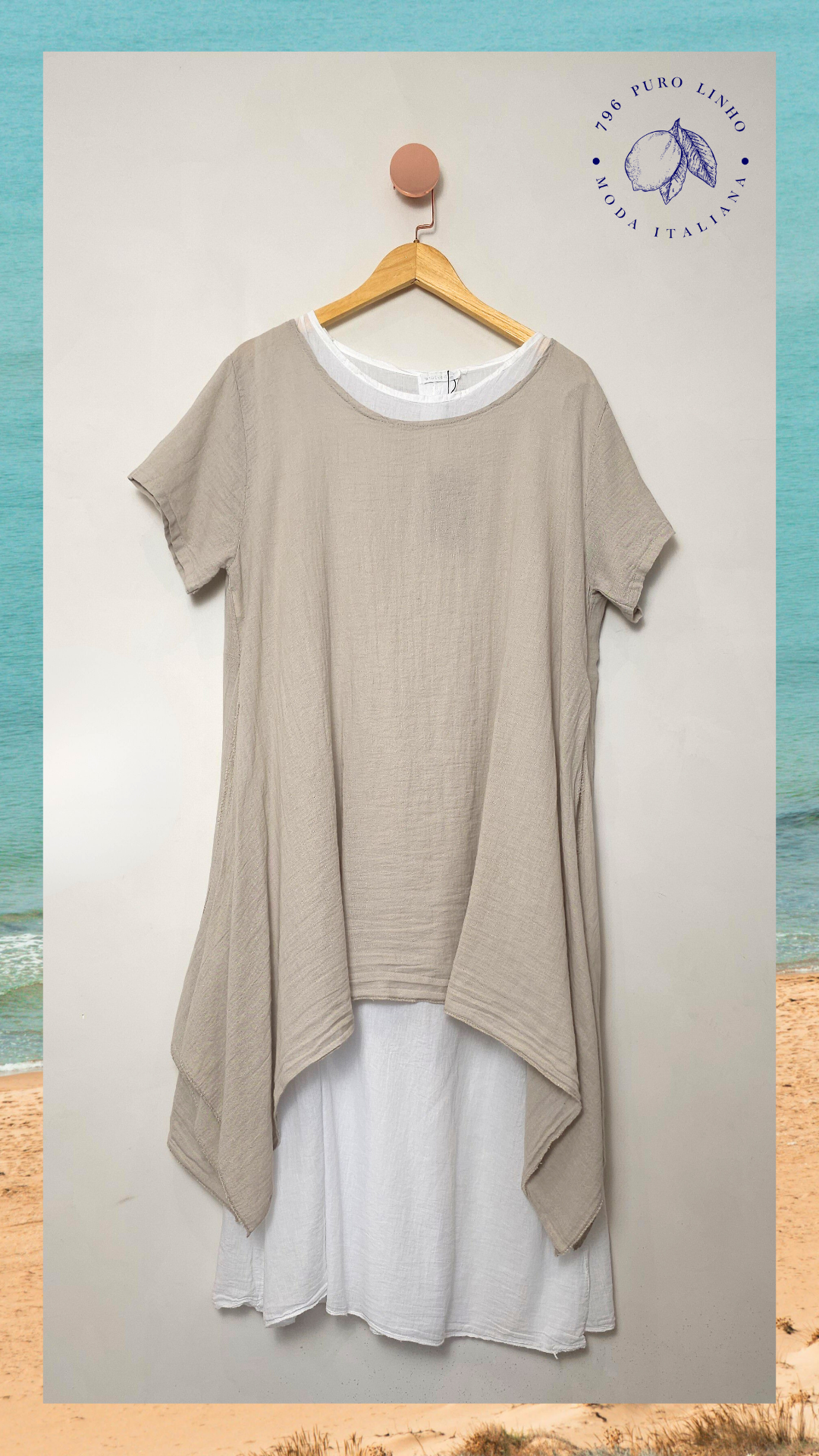 Vestido assimétrico sobreposto (duas peças) de manga curta.