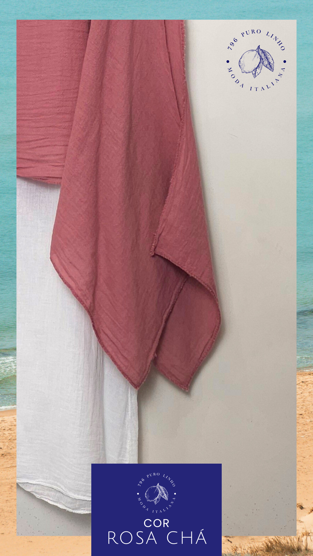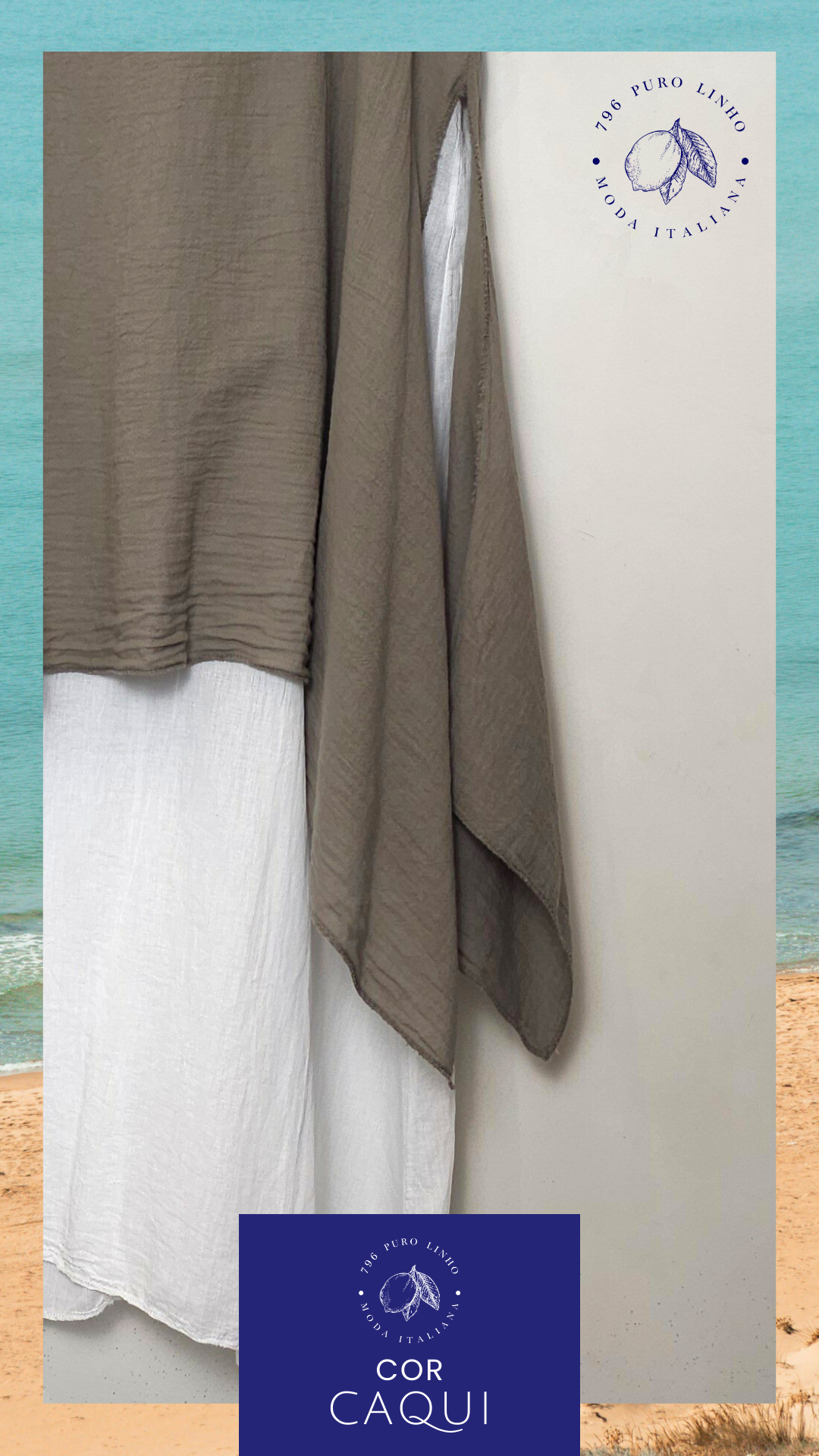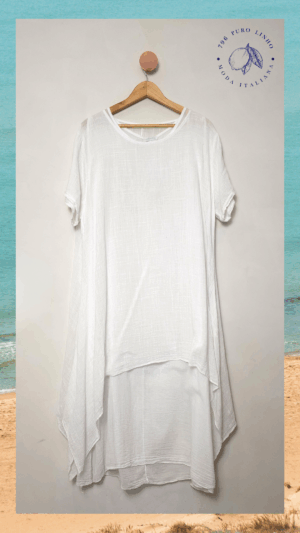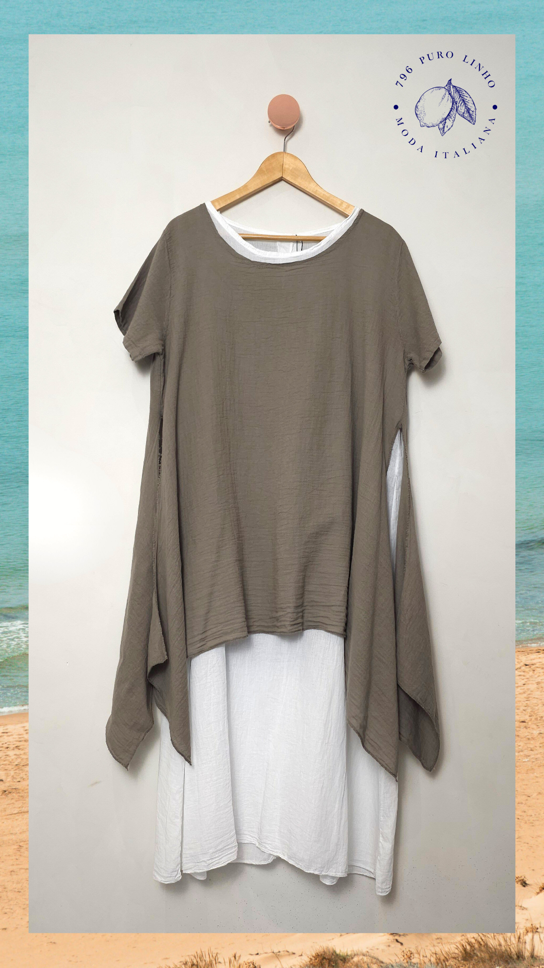 Vestido assimétrico sobreposto (duas peças) de manga curta.