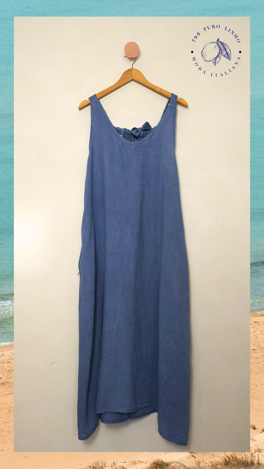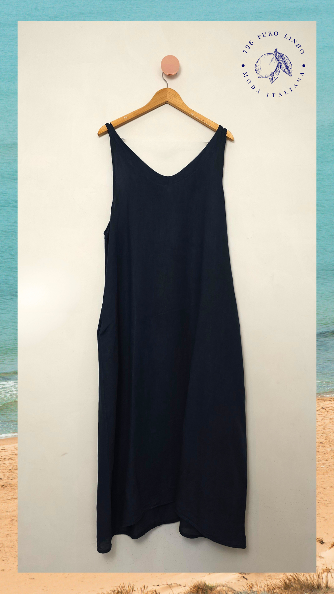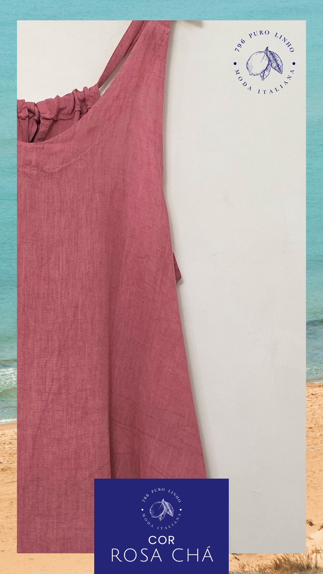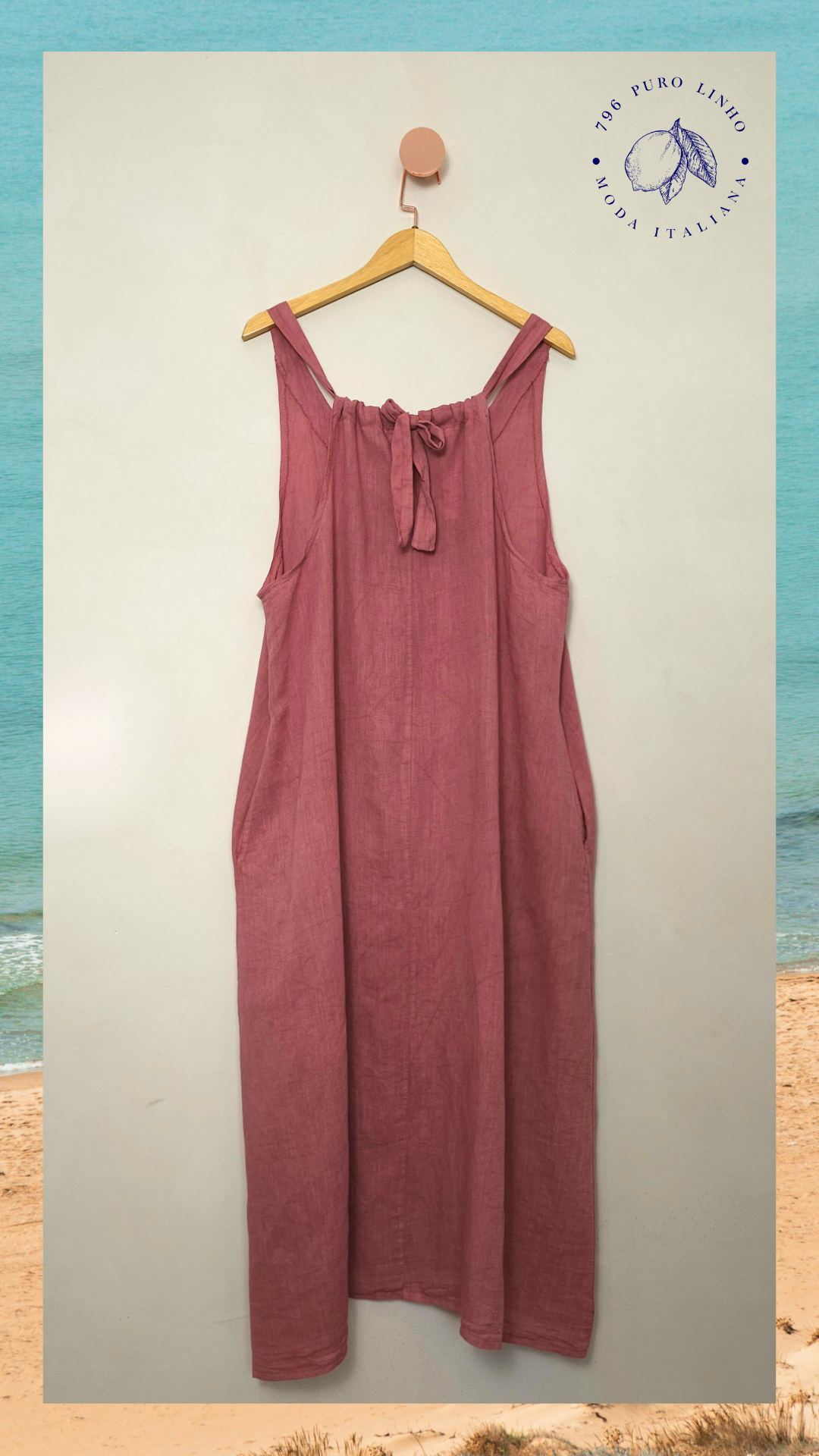 Vestido longo 100% linho italiano com ajuste de alça e bom bolsos laterais invisíveis.