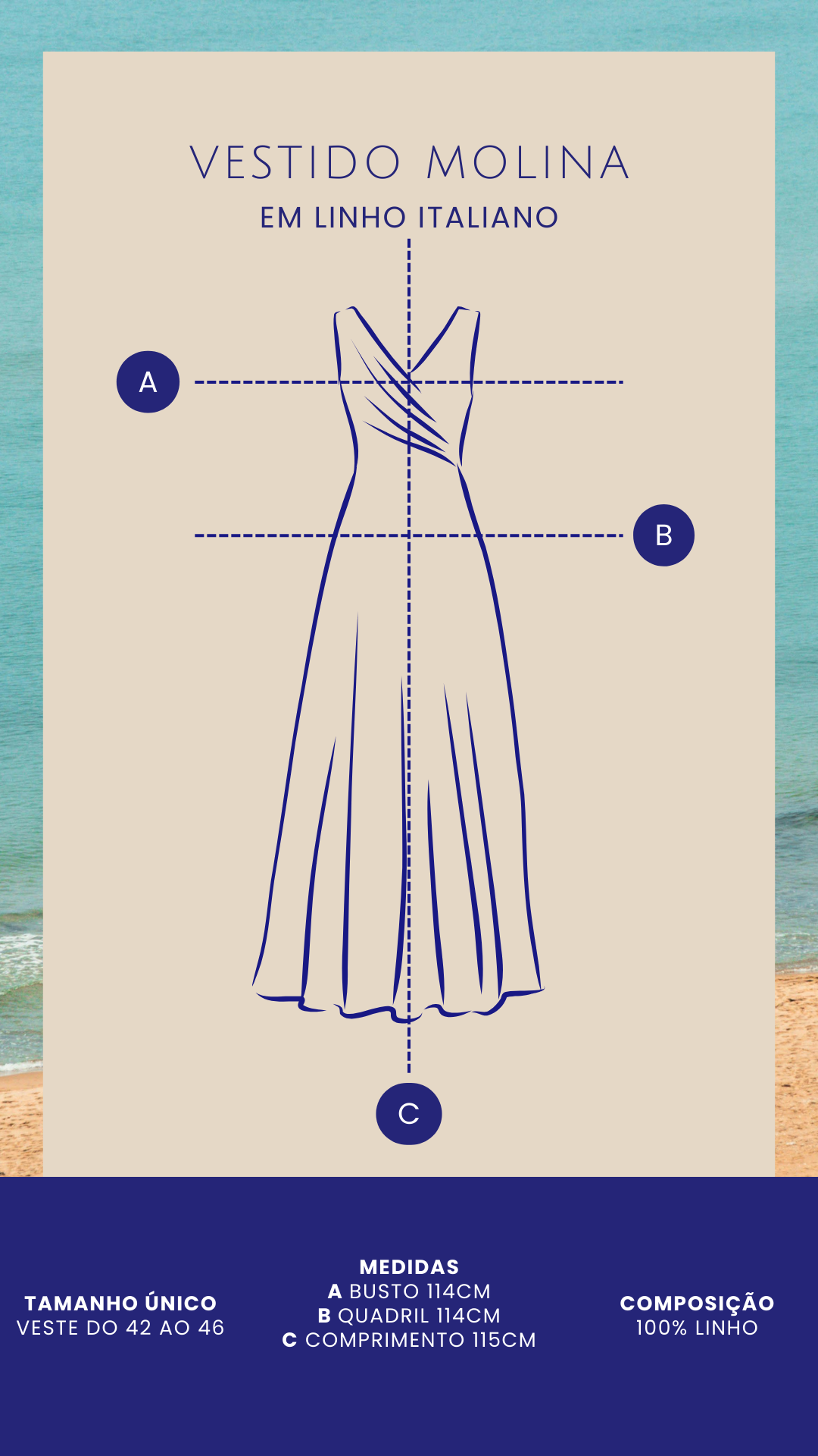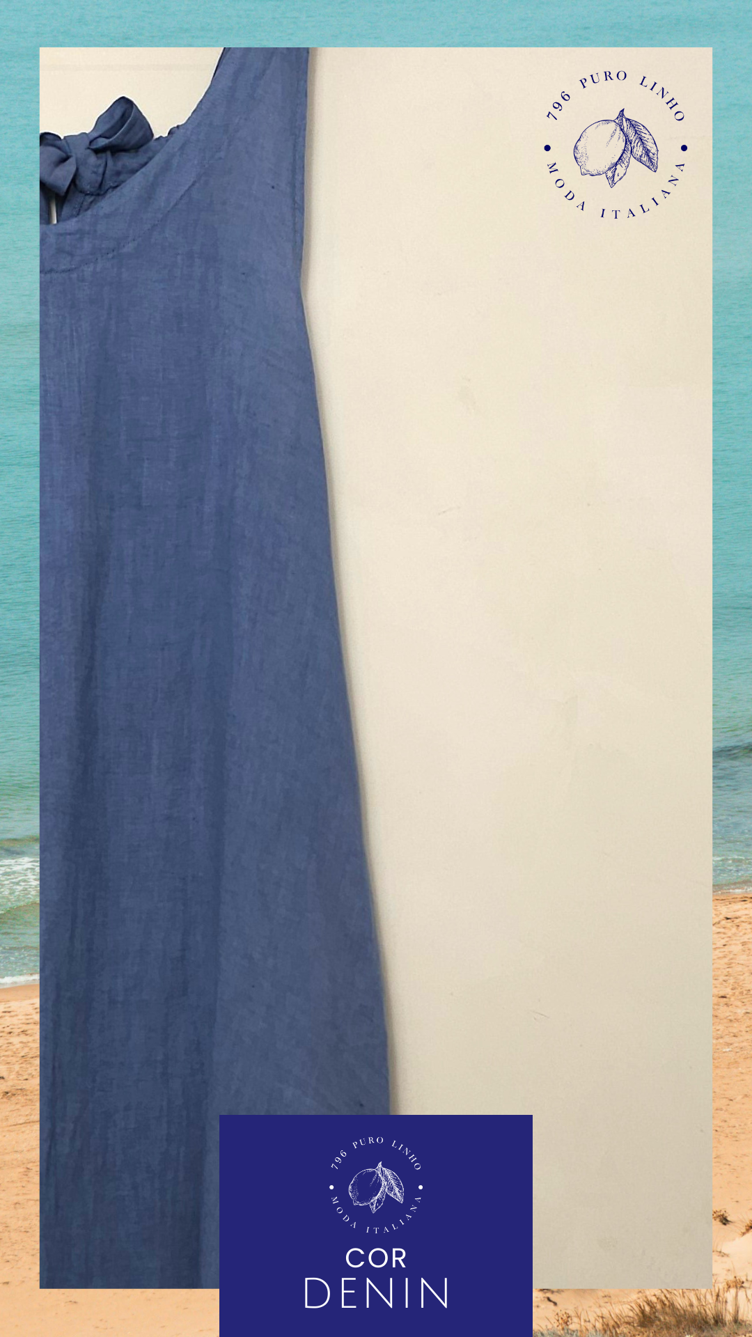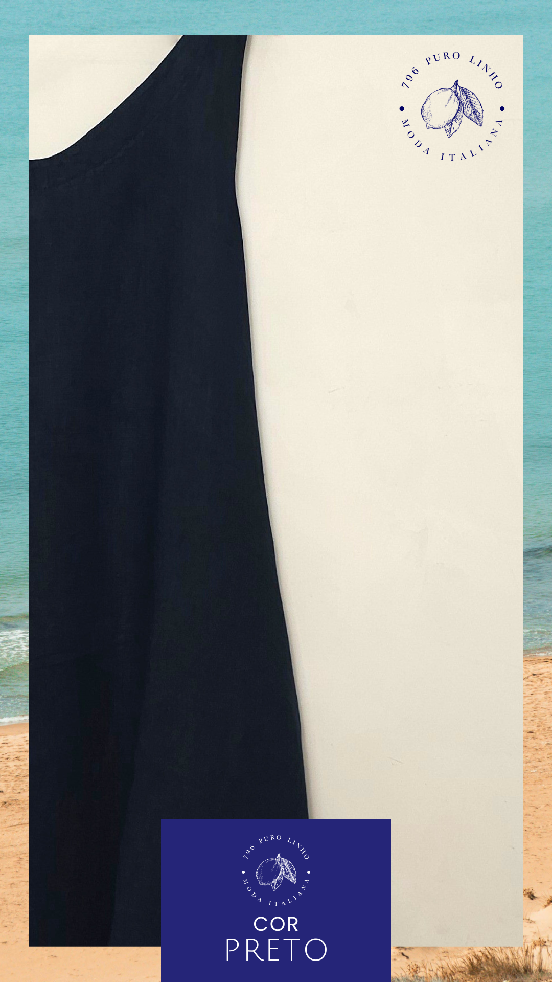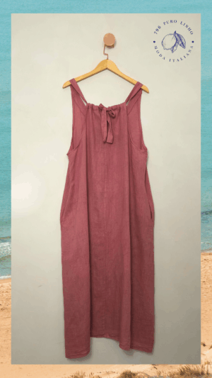 Vestido longo 100% linho italiano com ajuste de alça e bom bolsos laterais invisíveis.